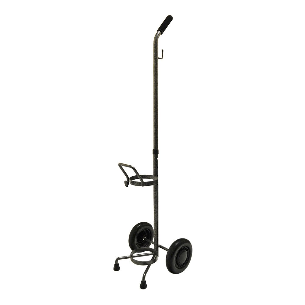 Adjustable cart for D or E size cylinder. Large composite wheels. Lightweight design. (Painted, Silver Vein) HEIGHT: 38.5″ – 43.25″ WIDTH: 11.5″ WEIGHT: 5 lbs