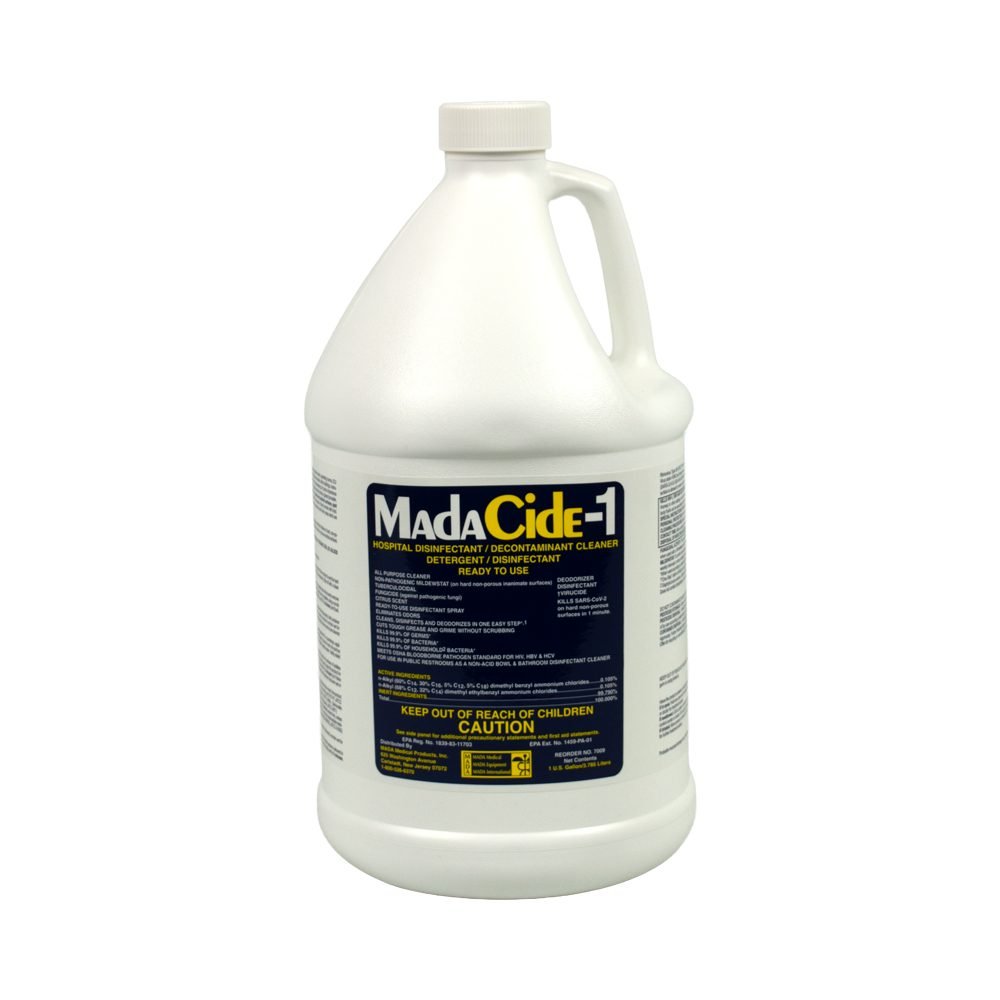 MadaCide-1 is a powerful disinfectant cleaner available in a 1 gallon bottle, designed for use in medical facilities and healthcare environments. It effectively eliminates bacteria, viruses, and fungi on contact, providing comprehensive surface sanitation. MadaCide-1 is alcohol-free, making it a safe and non-corrosive choice for use on a variety of surfaces, including medical equipment, examination tables, and high-touch areas.