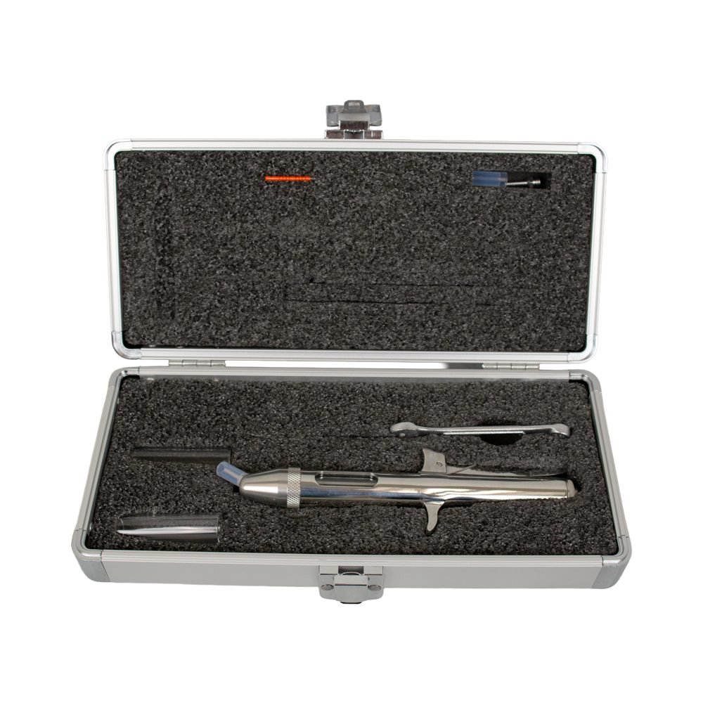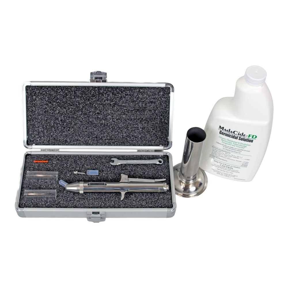 MadaJet XL instrument with Angle Head, (2)  400 Extenda Tips with Sheath 3/4″, MadaCide-FD (32 oz.),  507ST Stand, (3) Pyrex fill chambers, Custom Case